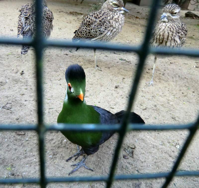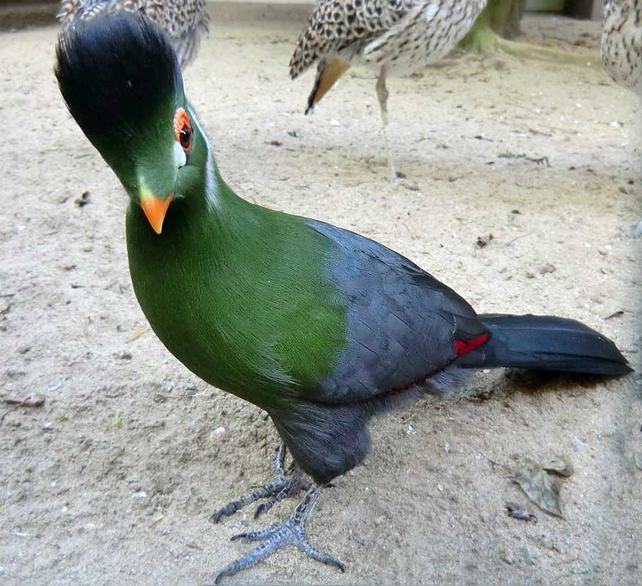 Weißohrturako im Wuppertaler Zoo im April 2014. Im Hintergrund stehen drei Kaptriele.