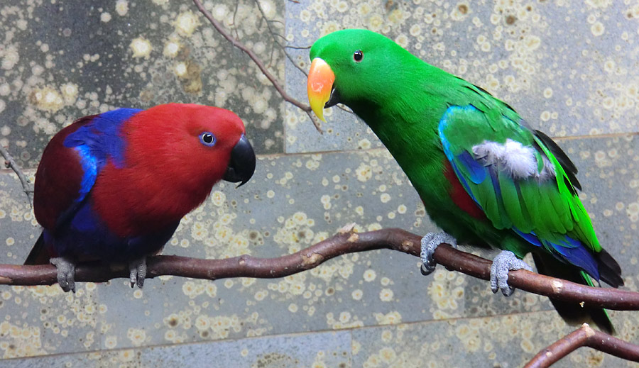 Weiblicher und männlicher Neuguinea-Edelpapagei im Zoo Wuppertal im Dezember 2013.