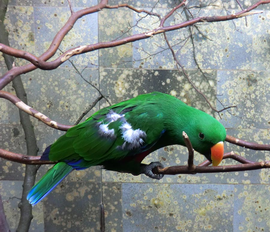 Männlicher Neuguinea-Edelpapagei im Zoo Wuppertal im Dezember 2013.