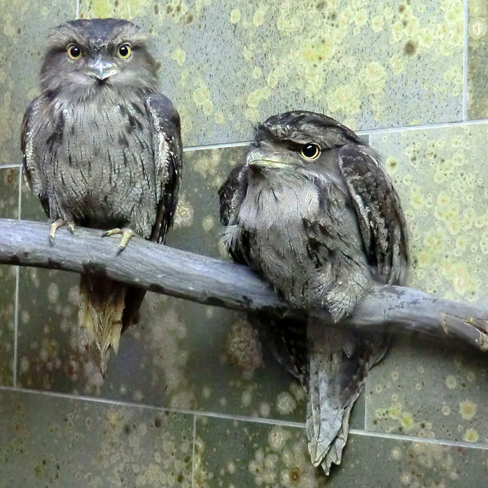 Eulenschwalme (Podargus strigoides) im Wuppertaler Zoo im Januar 2012.