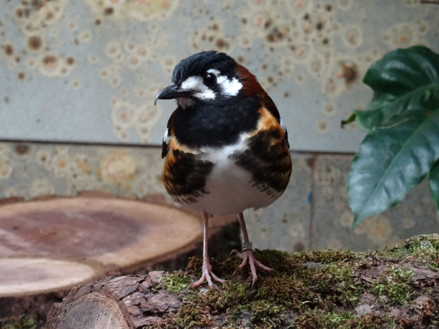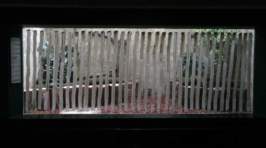 Allerdings ist derzeit die Gehegescheibe noch mit Kalkstreifen bestrichen, um den beiden Sumbawadrosseln die Eingewöhnung im neuen Gehege zu erleichtern.