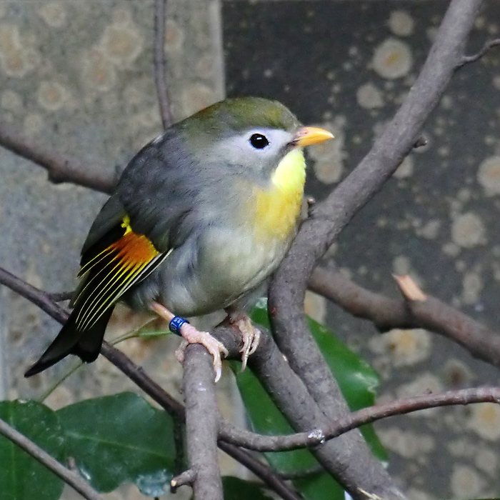 China-Nachtigall (Leiothrix lutea) im Wuppertaler Zoo im Februar 2012.